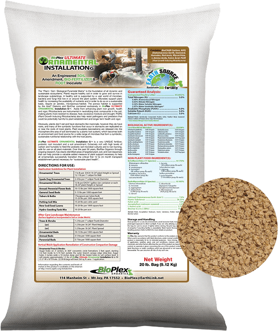 BioPlex ULTIMATE ORNAMENTAL Installation G™ is a very UNIQUE fertilizer, probiotic root inoculant and a soil amendment. Extremely rich with high levels of carbon and humates to feed the probiotic soil microbial cultures and is non-burning, safe for use on all plant materials. Over the past 30 years, BioPlex Organics through ongoing research, has clearly identified areas of targeted plant, soil, and root responses that can help provide a valuable added measure of plant support necessary to help all ornamentals successfully transition the critical first 12 to 24 month transplant establishment period necessary for “sustainable plant health”.